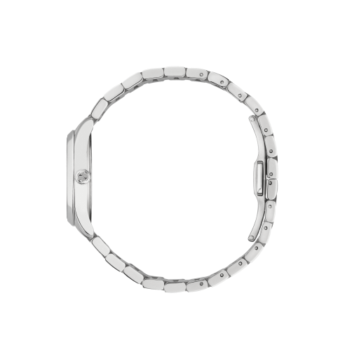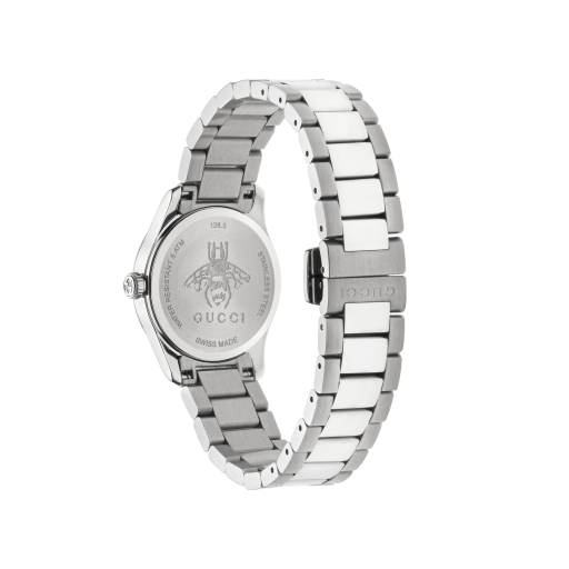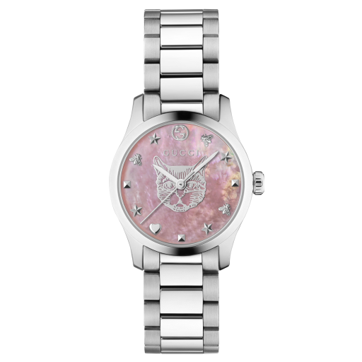 Composto da cassa e cinturino in acciaio, questo orologio con quadrante in madreperla rosa entra a far parte della linea G-Timeless nella collezione Cruise 2020. Al centro del quadrante è raffigurato il Mystic Cat, un codice storico della Maison, qui circondato da altri simboli Gucci come la stella, l’ape e il logo GG, che fungono da indici.