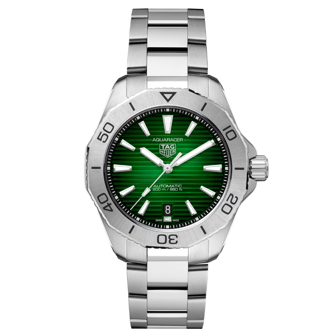 Con il suo quadrante verde intenso effetto “soleil” spazzolato in robusto acciaio, questo audace TAG Heuer Aquaracer è adatto a scoprire territori inesplorati. Uno strumento versatile ideale per spingerti oltre i limiti.