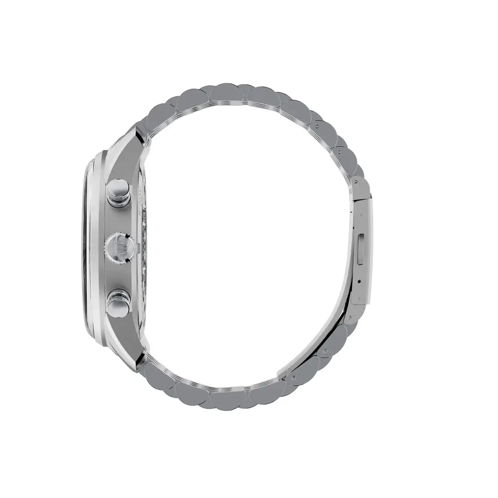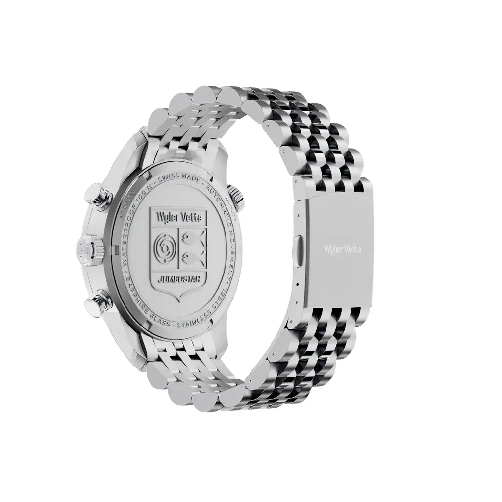 Ispirato alla versione italiana dell’iconico cronografo Jumbostar del 1968, con il caratteristico ribassamento del quadrante color crema con tacche poste in corrispondenza delle ore 12 in color rosso acceso. La seconda corona, posta a ore 10, aziona la ghiera interna girevole conta minuti.